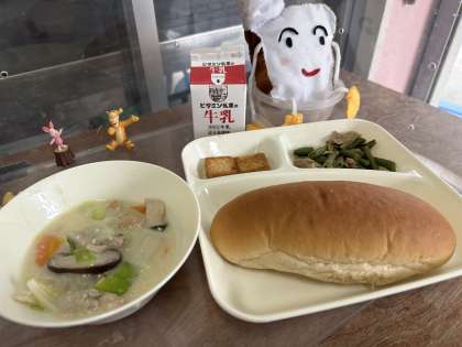 今日の給食は、はくさいのクリーム煮、あつあげのピリ辛じょうゆかけ、豚肉とさんどまめのオイスターソースいためです。