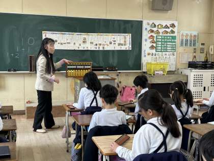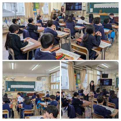 今日はゲストティーチャーに来ていただいて、そろばんの学習をしました。変わりそろばんを持ってきてくださったり、簡単な計算の仕方を教えてくださったりしました。