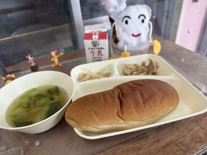 今日の給食は、鶏肉のからあげ、ハムと野菜の中華スープ、もやしとコーンの中華あえです。