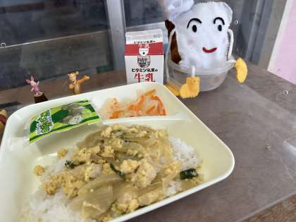 今日の給食は、親子丼、紅白なます、まっ茶大豆です。