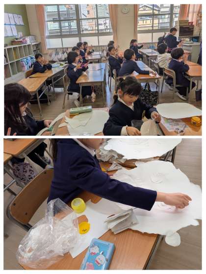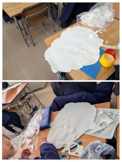 紙版画の版を作っています。顔の形を手でちぎって歯も1本1本丁寧に貼っています。どんな版画が刷り上がるかおたのしみに。