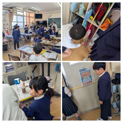1mの長さの紙テープを使って教室の中の1mを探しました。ロッカーの高さやドアの幅、先生の机の横、配膳台などたくさん友だちと協力して見つけました。