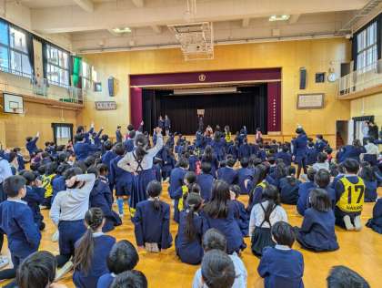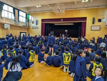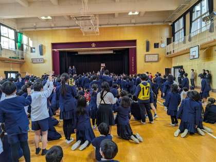 今日の集会は、じゃんけんゲームでした。6回、7回まで勝ち残った人がいました。最後の回は、勝ち残った人が2年生1人になりました。班の人に励ましてもらいながら勝ち進んでいました。みなさんは何回勝てたかな?