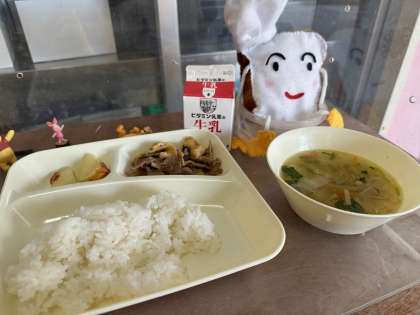 今日の給食は、豚肉の干しずいきのみそ煮、五目汁、焼きじゃがです。