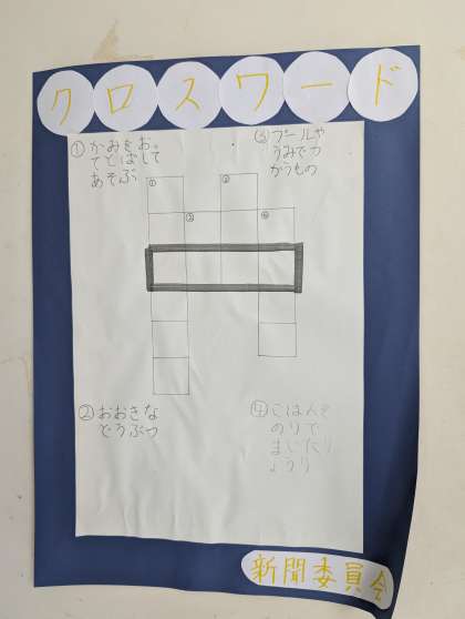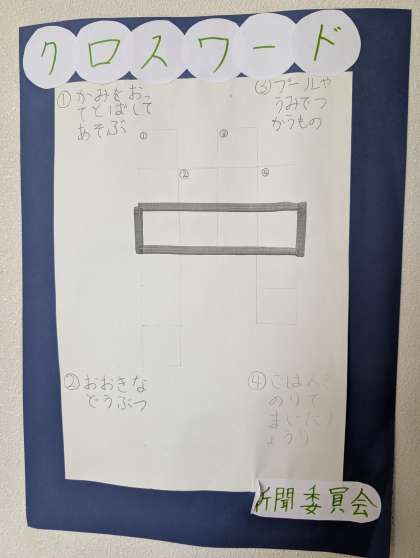 毎月の壁新聞だけでなく、クロスワードパズルも作成しました。ぜひ学校に来られたら解いてみてください。