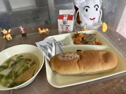 今日の給食は、豚肉とごぼうの煮もの、なにわうどん(とろろこんぶ)、固形チーズです。