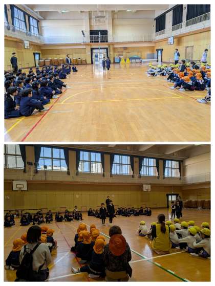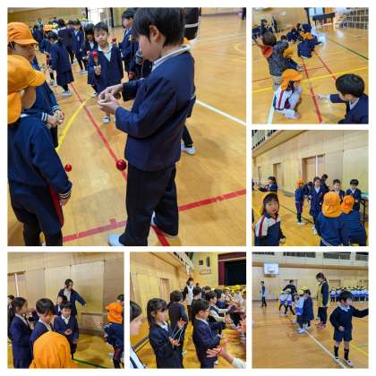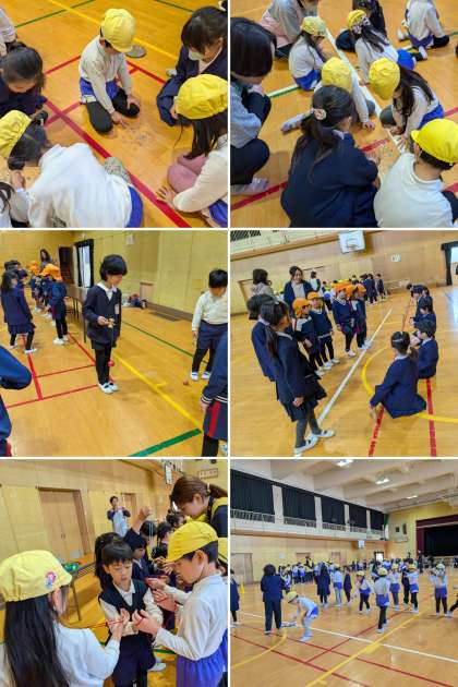 地域の幼稚園、保育園、こども園に来ていただいて、1年生と交流しました。1年生は、この日のために毎日遊びを練習してきました。幼稚園、保育園のお友だちに一生懸命説明して教えてあげていました。