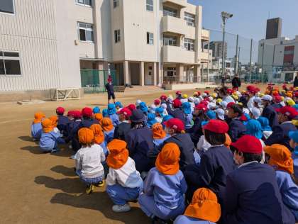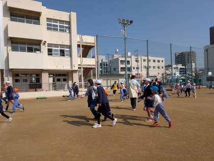 20分休みは、5年生と幼稚園、保育園の約200名くらいの子どもたちが手つなぎ鬼ごっこをしました。広い運動場を5年生1人に幼稚園、保育園の子たちが2人スピードを3人で合わせて走る姿が微笑ましかったです。
