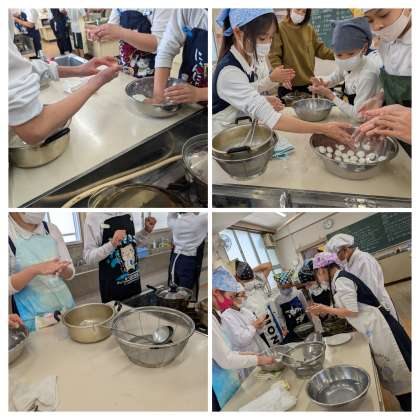 27日は、5・6時間目に学年茶話会を計画していました。午前中、学年を半分に分けて、白玉だんごとポップコーンをつくりました。間に幼稚園、保育園の人との交流もあり、忙しいけど楽しいこといっぱいの1日でした。みんなで協力して作っているところです。職員室も美味しくいただきました。