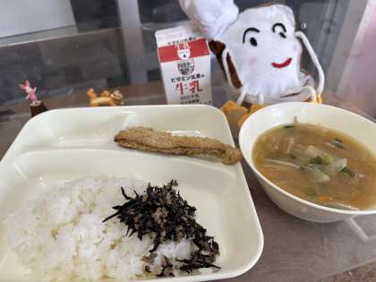 今日の給食は、いわしフライ、みそ汁、牛ひじきそぼろです。