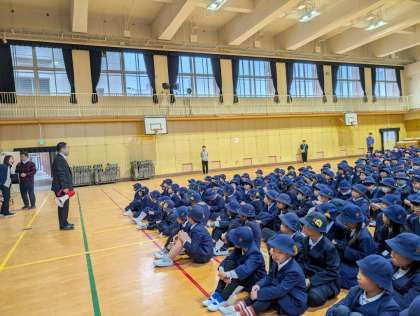読み聞かせのあと、避難訓練をしました。雨だったので、はじめに講堂に避難しました。次に津波を想定して3階以上に逃げました。先にお話を聞いていたのでどの子も真剣に取り組むことができました。