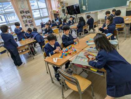 1年生は、卒業の祝う会のために輪飾りを作っています。