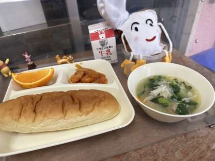 今日の給食は、えびのチリソースいため、中華がゆ、デコポンです。