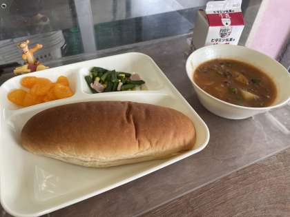 今日の給食は、ビーフシチュー、ベーコンとさんどまめのソテー、みかん(缶)です。