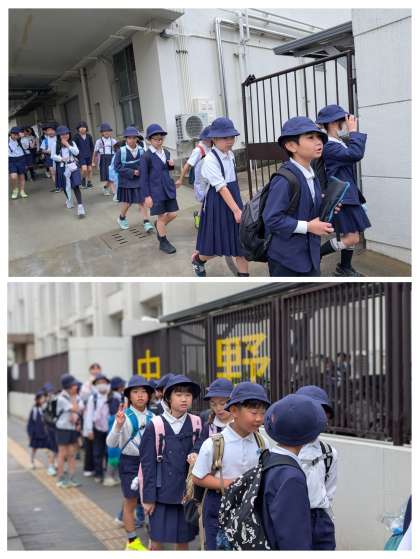 3・4年生元気に出発しました。雨もやんでよかったです。