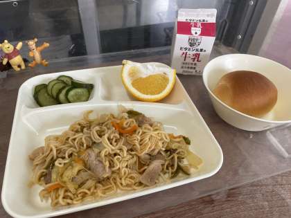 今日の給食は、焼きそば、きゅうりのしょうがづけ、あまなつかんです。