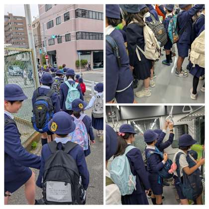今日は1年・6年生が大阪・関西万博に出かけました。6年生がペアで駅まで誘導してくれています。電車の中でも1年生に席を譲って優しく声をかけています。