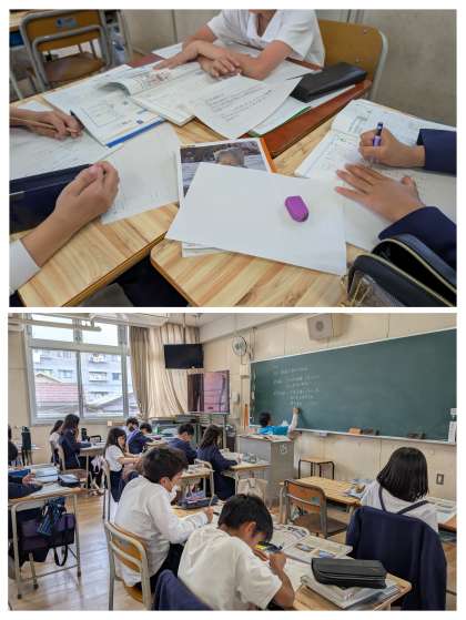 5年生は、国語と社会でした。国語では、委員会に分かれて6年生にインタビューしたいことを話し合いました。社会では、地球儀や地図で世界のことを学習しました。