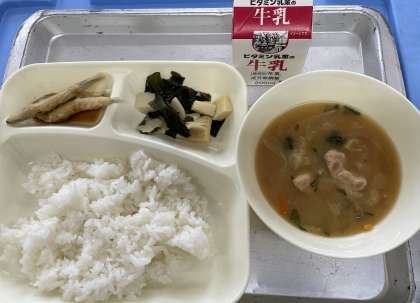 今日の給食は、きびなごてんぷら、みそ汁、わかたけ煮です。