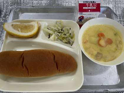 今日の給食は、鶏肉とコーンのシチュー、キャベツのひじきドレッシング、かわちばんかんです。ラッキーにんじんが入っていました!