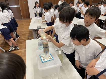 ペットボトルで作られた「砂ろ過」や「粒状活性炭ろ過」の装置を使って濁った水をきれいにしたり、においをとったりしました。