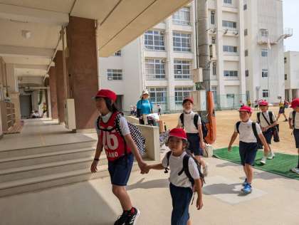 時間差で出発しました。出発を待っている班は、校内にあるクイズを見つけて解いていました。