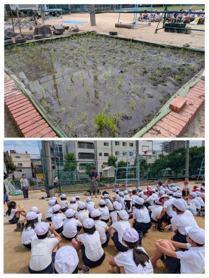 今年も田植えの季節がやってきました。四條畷で無農薬の農業をされている奥田さんに来ていただいて田植えの仕方を教えていただきました。1人3株ずつ均等になるように植えました。明日から毎日水を絶やさないよう5年生が頑張ります。