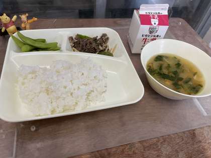 今日の給食は、チンジャオニューロウスー、中華みそスープ、えだまめです。