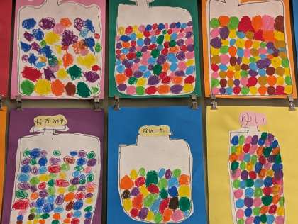 びんの中のあめを描きました色とりどりのあめをしっかり塗り込みました。