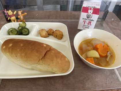 今日の給食は、いかてんぷら、フレッシュトマトのスープ煮、きゅうりのバジル風味サラダです。