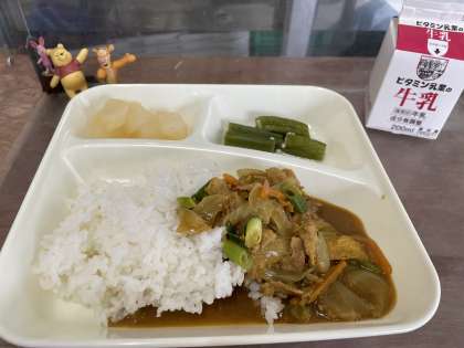 今日の給食は、和風カレー丼、オクラの甘酢あえ、和なし(カット缶)です。