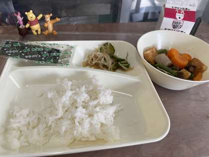 今日の給食は、牛肉と野菜のいため煮、きゅうりともやしのおひたし、焼きのりです。
