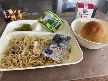 今日の給食は、和風焼きそば、きざみのり、オクラのかつお梅風味、まっ茶大豆です。