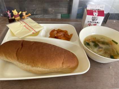 今日の給食は、えびチリソース、中華スープ、スライスチーズです。