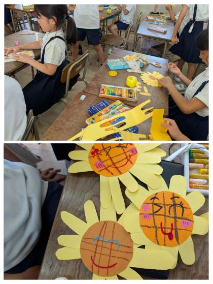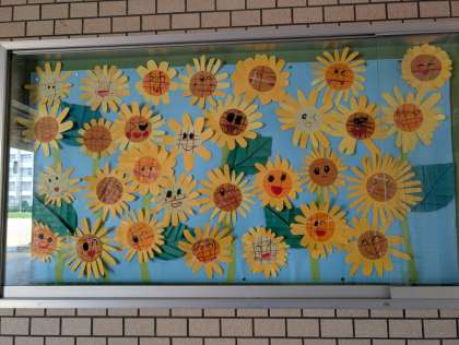 7月の玄関掲示は2年生です。可愛いひまわりがいっぱいです。