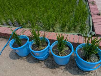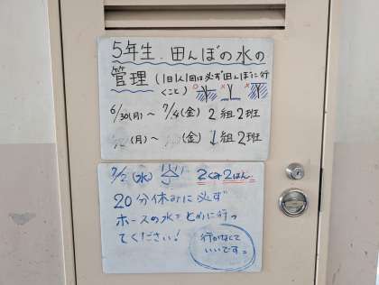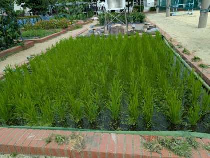 6月2日に田植えした稲がすくすく育っています。5年生が当番制で育てています。バケツ稲も大きく育っています。