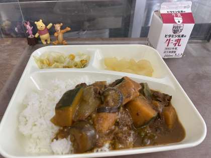 今日の給食は、夏野菜のカレーライス、サワーソテー、洋なし(カット缶)です。