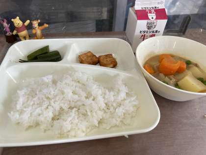 今日の給食は、みそ肉じゃが、あつあげのしょうがじょうゆかけ、オクラのおかかいためです。