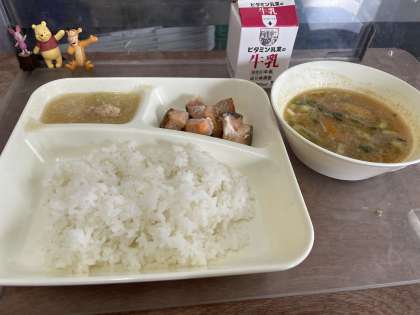 今日の給食は、さけのつけ焼き、みそ汁、とうがんの煮ものです。