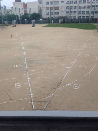 雨と雨の合間を縫って、なんとかソフトボール投げと50m走のラインを引きました。連日の雨で予定が変更されているスポーツテスト・・・。明日こそできますように!