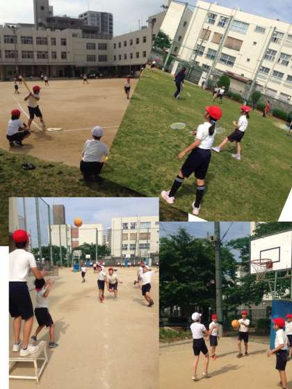 そこで・・・スポーツクラブは、予定通り野球をするために、運動場に2面コートを作っています。そんな中、バドミントンクラブは、芝生の上でバドミントンです。なんだかほのぼのして楽しそうですね。一方、写真は、断じてバスケットボールクラブではありません。卓球クラブが青空に向かってシュートです。