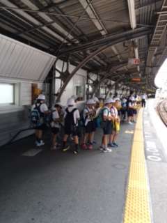 電車の中ではプリントにメモをたくさんしました。駅に着くと他のお客さんが乗ってくるので通れるようにスペースを空けながら、発車メロディを聞いていました。すべての駅ごとにメロディが違うことが珍しく感じたようでよく聞いていました。