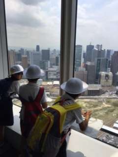 スカイビル見学は、初めは高さに驚いていましたが慣れてくると窓際まで近づいていって班の友達と一緒に何が見えるかよく見ていました。