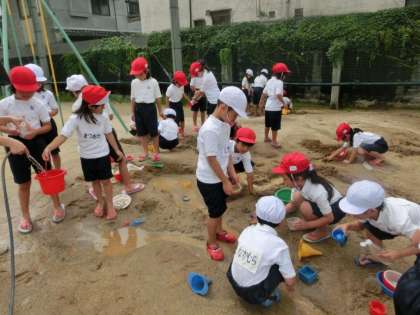 1年生が生活科の学習で「どろんこあそび」「しゃぼんだまあそび」をしました。体操服に着替え、赤白帽をかぶり、ビーチサンダルをはいただけで、気分はわくわくです。