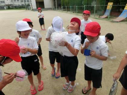 一方、「シャボンだまあそび」、うちわの枠を上手に使ってシャボン玉を作っている子がいます。シャボン玉を空に飛ばすだけでなく、コップにストローをさして、ぶくぶくしながら大きなあわを作るのがおもしろかった子どもたちも多かったです。