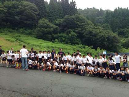 雨模様ですが、緑が綺麗です。学年写真をパチリ。