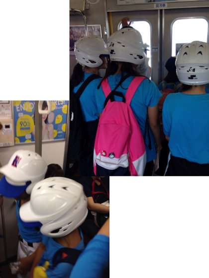 ヘルメットは手に持つのではなく被って移動するのが約束です。電車の中でもこの通り!