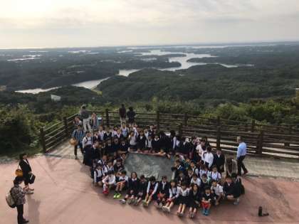 絶景!! 横山展望台からの眺望です。リアス式の伊勢志摩特有の地形、風景が六年生に迫っています。展望台からはサミットが行われた賢島も見えています。