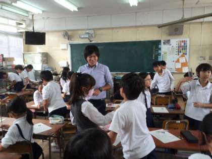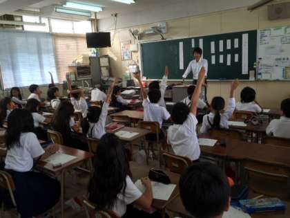 4年生の子どもたちは、いつもと違う雰囲気に興味津々・・・。理科では、「人間の体の不思議」を学習しました。目を閉じて・・・・「バン!!」「さて、どっちの手で机をたたいたと思いますか?」「えっ!?」 みんなで目を閉じて手をつなぎます。円になります。隣の人に手を握られたら、自分の隣の人の手を握り・・・握手の伝言? なんだか一瞬遅れちゃう。どうやら、脳の働きに関係がありそうだ。国語では、「どんどん」「がやがや」「すいすい」など様子を表す言葉を使っての文作りにチャレンジしました。(「オノマトペ」というそうです。)「どんどん」・・・たたく音?・・・どんどん進む・・・。あれ?色々な意味があるぞ。