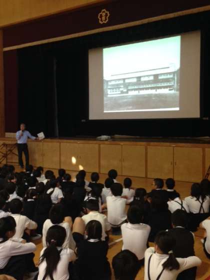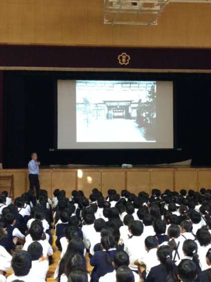 今朝の児童朝会は、講堂でありました。小鳥校長先生が中野小学校90年の歴史を講堂のスクリーンに画像を映しながら話してくださいました。